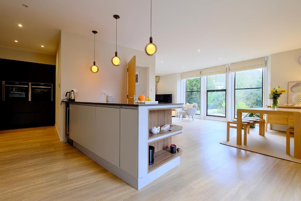 Stairs rise to the spectacular first-floor open-plan kitchen, dining and living space. The fully fitted kitchen features a comprehensive range of high-quality Neff appliances including two ovens, coffee machine, wine cooler, Quooker tap, large central island and extensive storage. Floor-to-ceiling glazing to the front elevation floods the space with light while maintaining privacy and providing picturesque views.