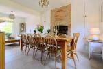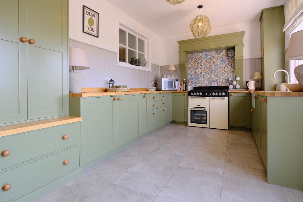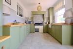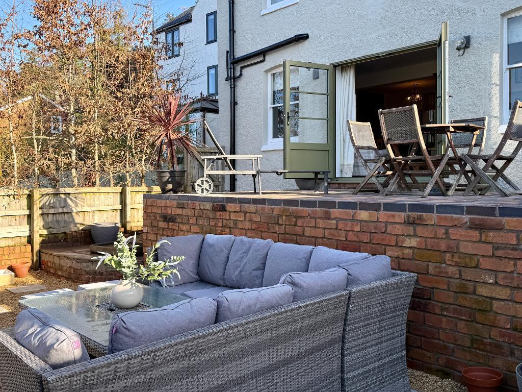 The kitchen is fitted with extensive wooden work surfaces, a statement range cooker and a larder cupboard, while a contemporary and practical tiled floor runs throughout the living areas. Twin French doors open onto the south-facing landscaped garden, where a raised terrace, decked seating area and low-maintenance planting create a tranquil and private outdoor haven for both entertaining and family life.