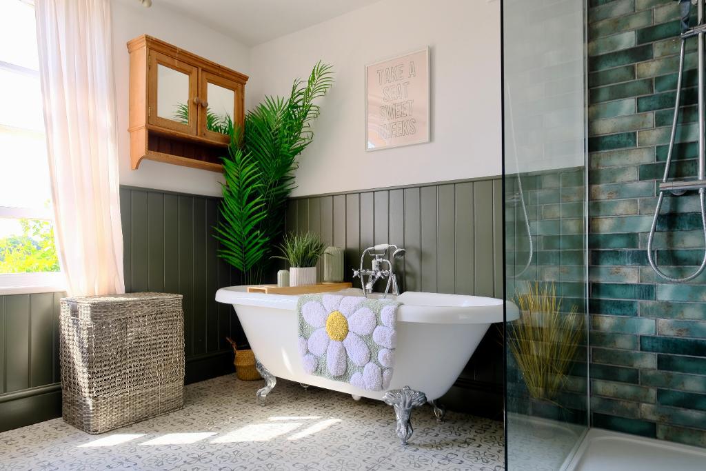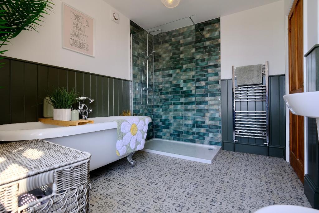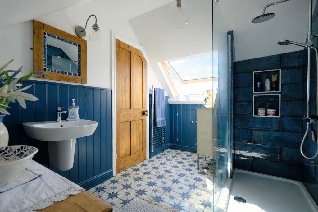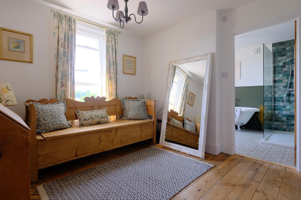 On the first floor, a generous landing with wonderful views over the countryside, gives access to three well-appointed bedrooms and a luxurious newly installed family bathroom featuring a contemporary walk-in shower.