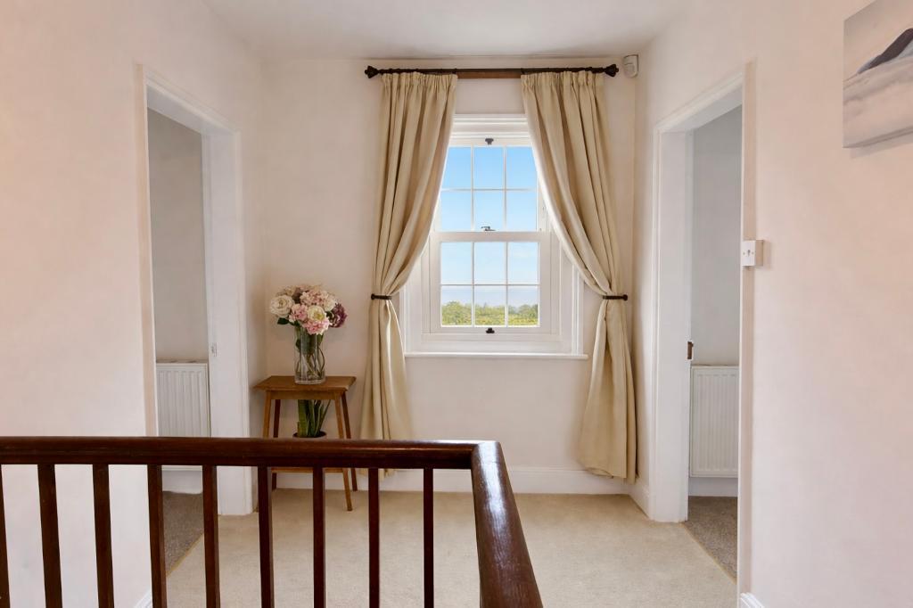 From the hall rises an elegant staircase framed by a striking arched feature window. To one side lies a reception room currently arranged as a playroom, while opposite sits the principal sitting room: warm, welcoming and anchored by another log burner; an inviting retreat for quieter moments or relaxed entertaining. Notably, the house retains a warmth throughout that is unusual for a property of this age.
