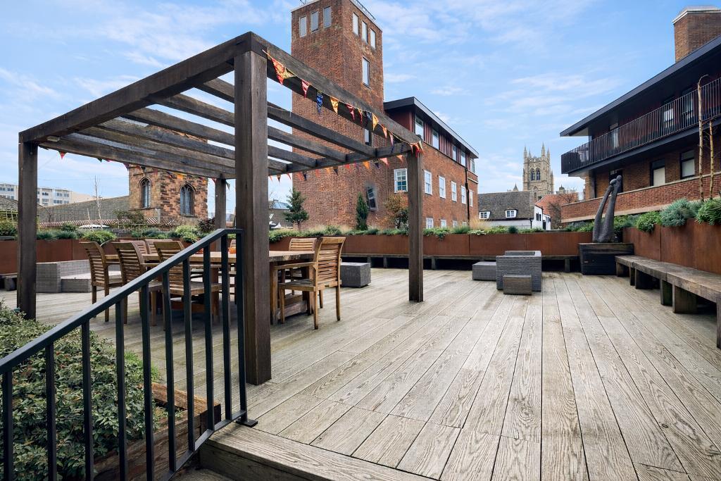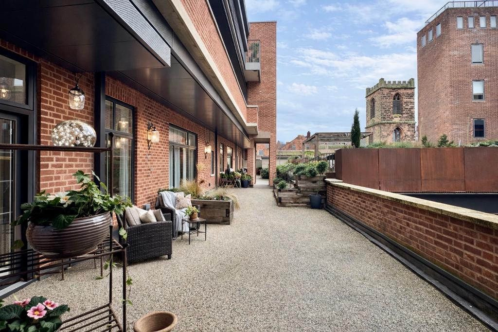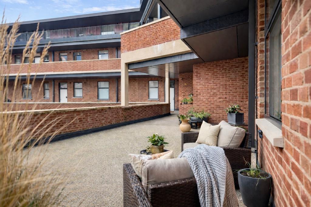 No. 8 is one of only four apartments with a private patio or terrace. In addition, an elevated city garden is opposite and available exclusively for all residents. This features a wooden pergola, colourful planting to create a tranquil green environment plus designated areas of wooden benches, table, chairs and pretty architectural uplighting.