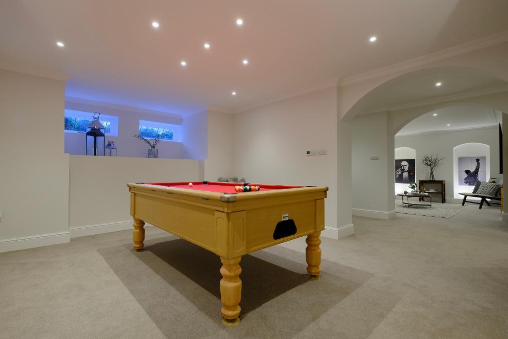 The lower ground floor has been expertly converted to create exceptional accommodation with underfloor heating and plush carpeting. This level includes a TV/cinema room, two games rooms (one currently housing a snooker table), a gym room presently used as a laundry room, and a plant room housing the central heating system and hot water tank.