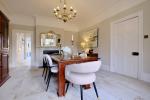 The ground floor is approached via an impressive recessed porch with limestone steps and original tiled flooring opening into a gracious entrance hall with restored timber floors, soaring ceilings and elegant detailing. Two outstanding bay-fronted reception rooms - a formal drawing room and refined dining room - provide exceptional entertaining spaces, each enhanced by original fireplaces and finely preserved decorative mouldings.