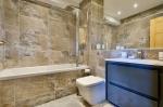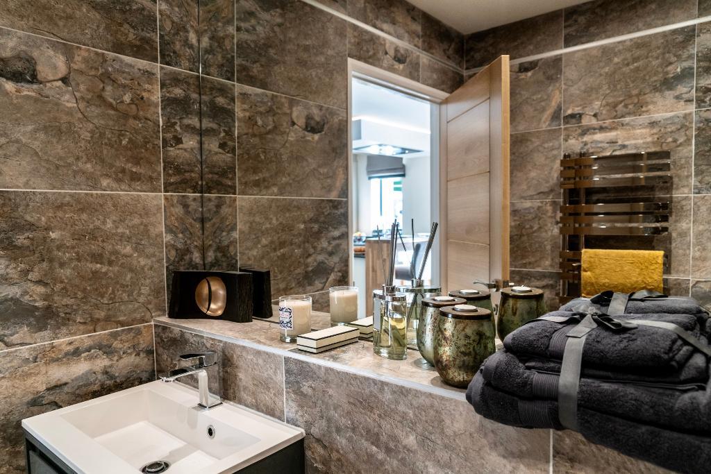 The elegant family bathroom is fully tiled and fitted with both overhead and handheld showers, a contemporary wash basin with vanity unit, and a polished heated towel rail.
