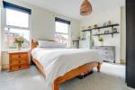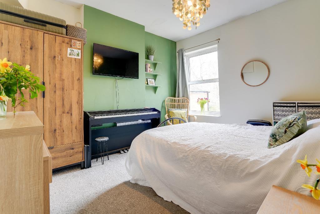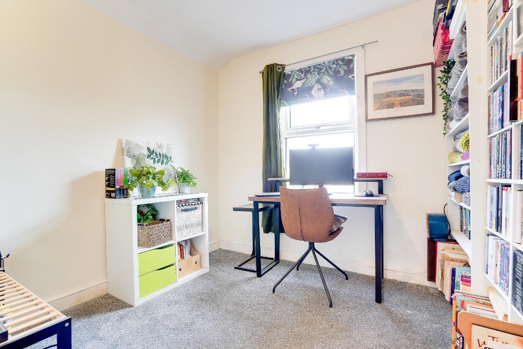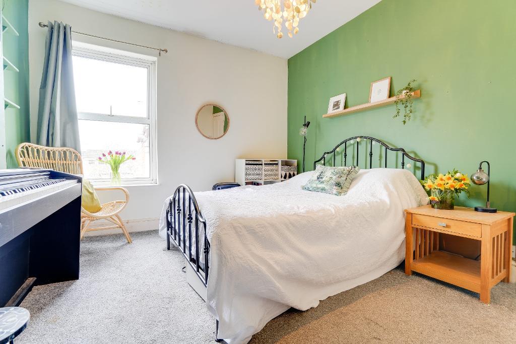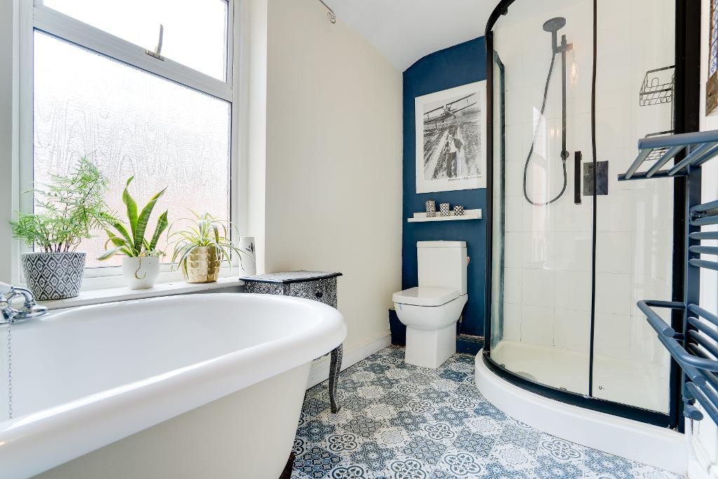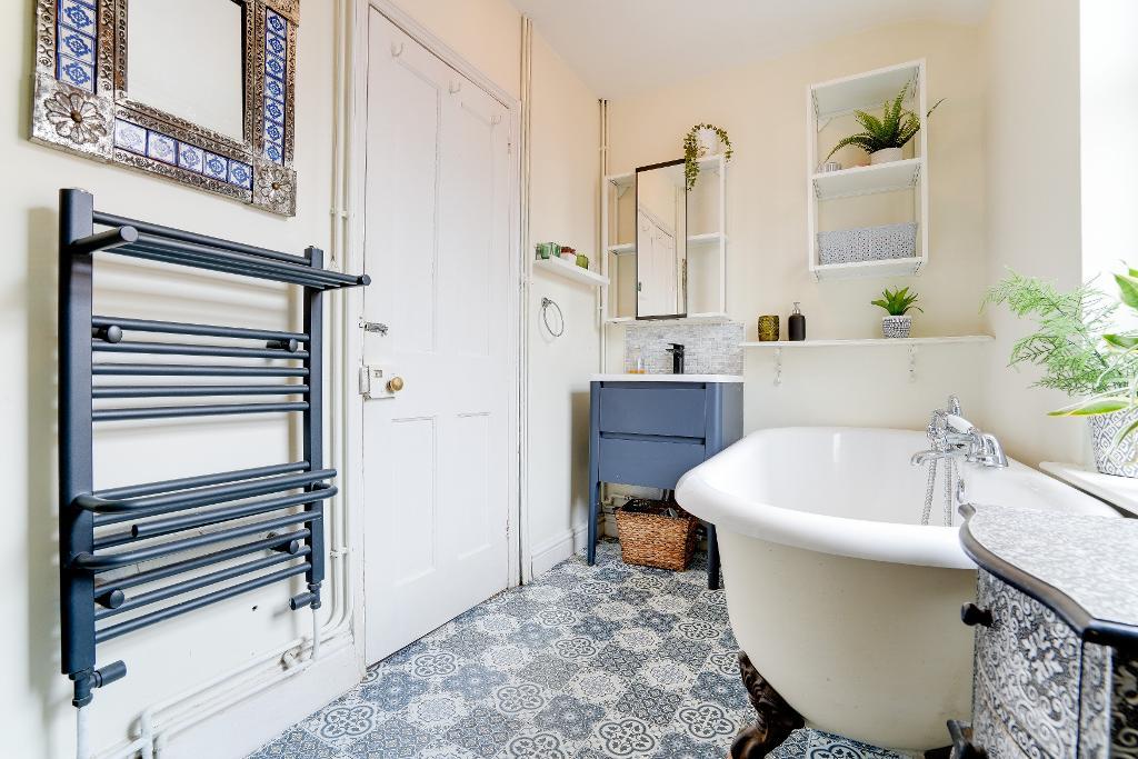 Upstairs, the first floor hosts three well-proportioned bedrooms. The principal bedroom is bright and spacious, with two large windows to the front. A second double bedroom enjoys views over the garden, while a third bedroom is currently used as a home office but could equally serve as a single bedroom. The family bathroom features a classic claw-foot bath alongside a separate shower.